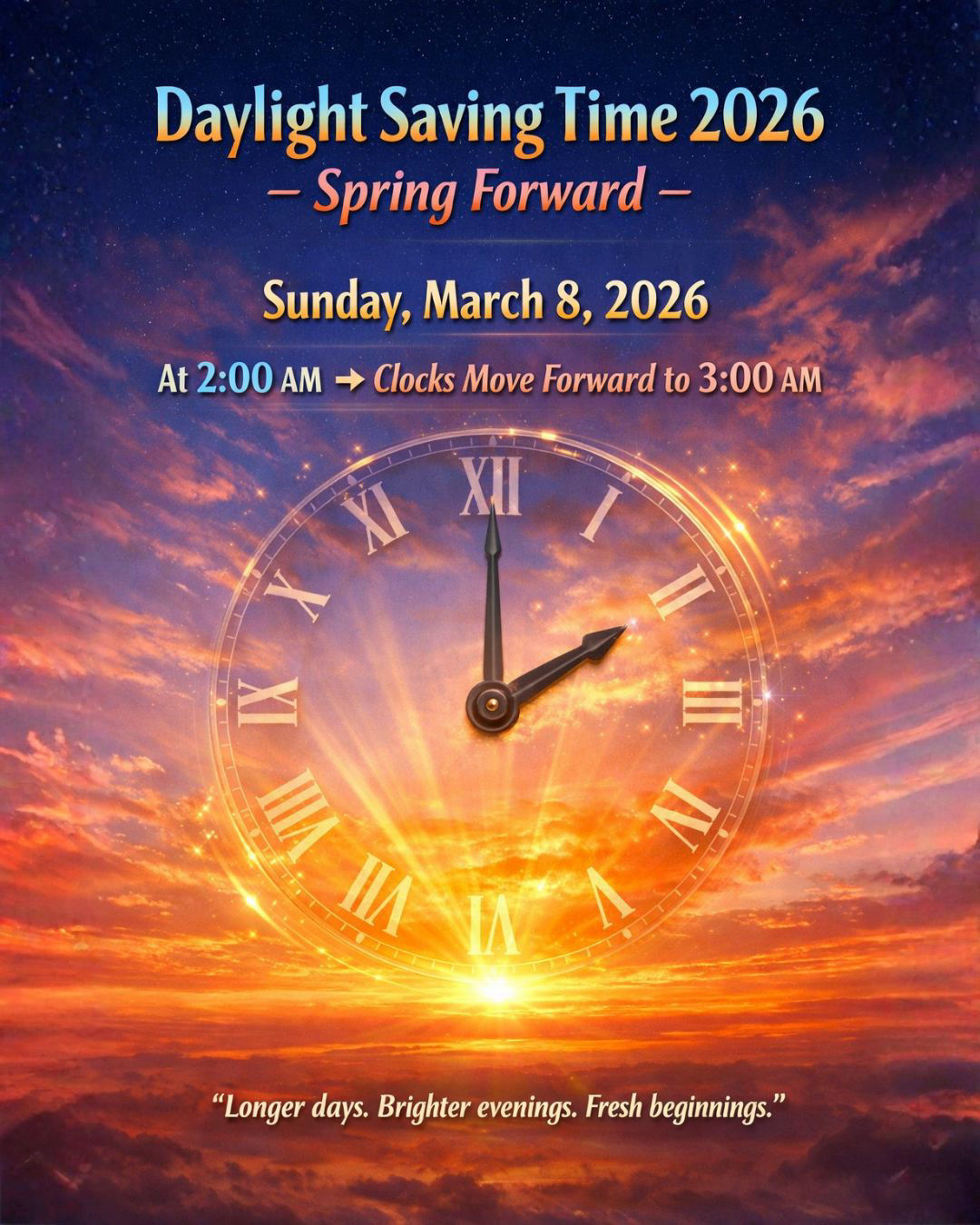 Please make sure to adjust your clocks on Sunday March 8 so you won't be late coming to church or watching online.